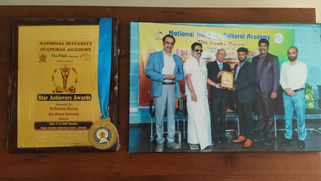 In recognition of his dedication to dentistry and community care, Dr. Naveen Kumar and Global Dentistry were honored with the Star Achievers Award by the National Integrity Cultural Academy and The Peaks Magazine on April 27, 2025, at the Kavikko Convention Centre, Chennai. This prestigious award celebrates excellence in clinical expertise, patient service, and ethical practice.